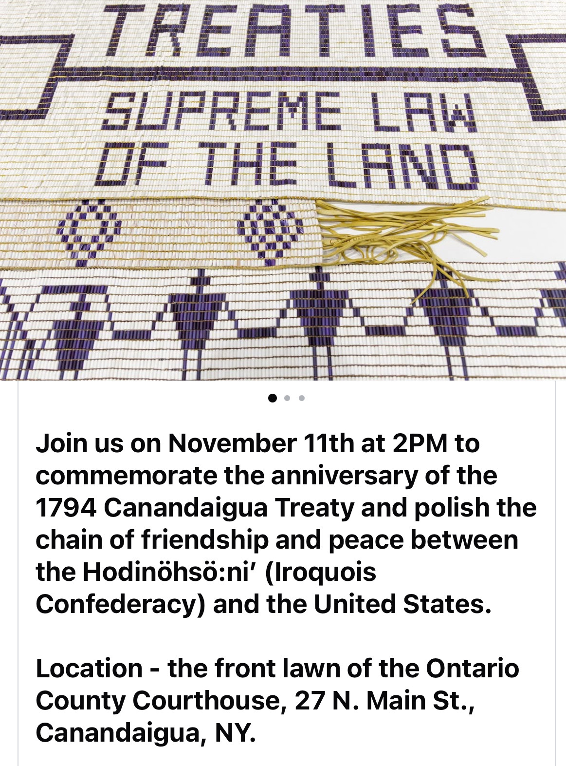 The United States and the Haudenosaunee will honor the 231st Anniversary of the Canandaigua Treaty. This treaty is historic as this is one of the earliest treaties ratified by the US Congress with a Native Nation. The 1794 Canandaigua (Pickering) Treaty is celebrated across Haudenosaunee territory as the treaty re-affirms our status as an sovereign nation.