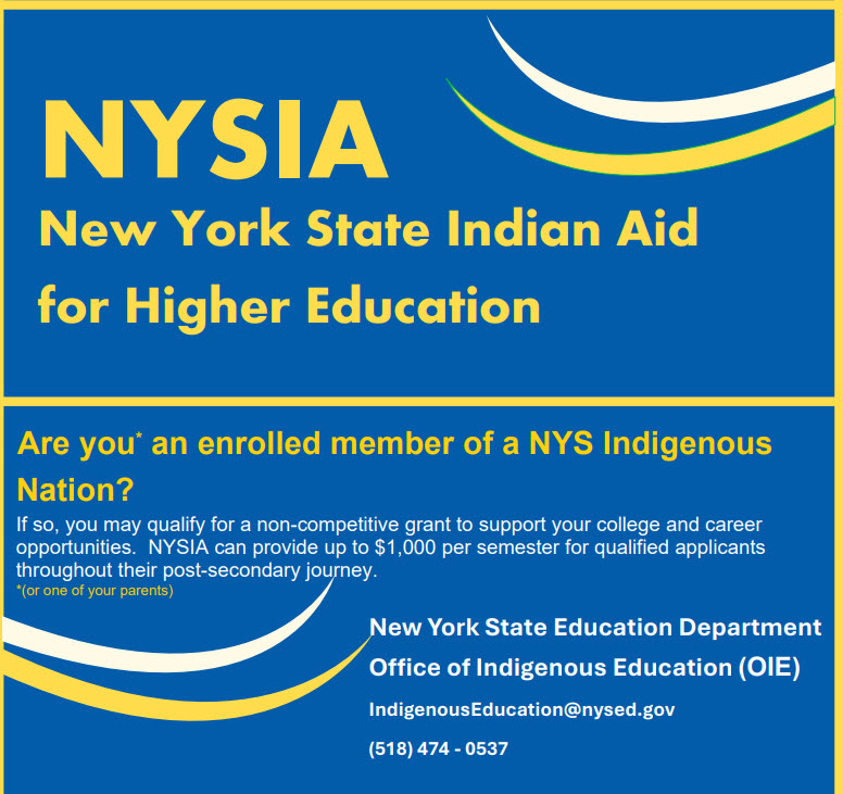 New York State Department of Education is pleased to share the newly updated New York State Indian Aid (NYSIA) Flyer and Student Application for students entering or attending college or University – including trade school programs.