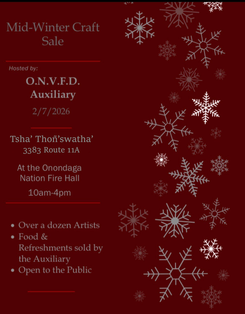 On Saturday, February 7, 2026, the Onondaga Nation Volunteer Fire Department will be hosting a Mid-Winter Craft Fair. There will be over a dozen local artists! Food and Refreshments provided by the ONVFD Auxiliary.